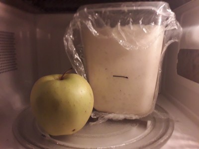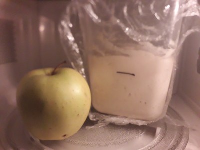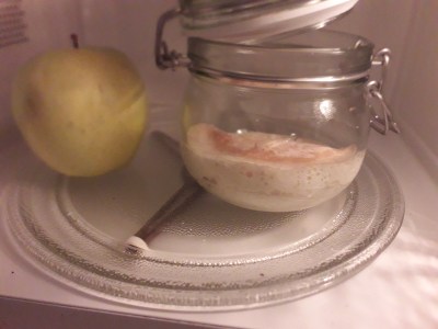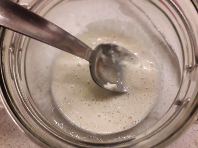 1) Mescolare Insieme i due ingredienti e lasciar lievitare lontano da correnti, possibilmente nel forno con luce accesa e vicino a della frutta, meglio mele.