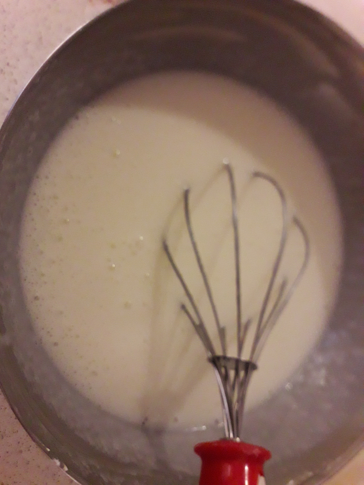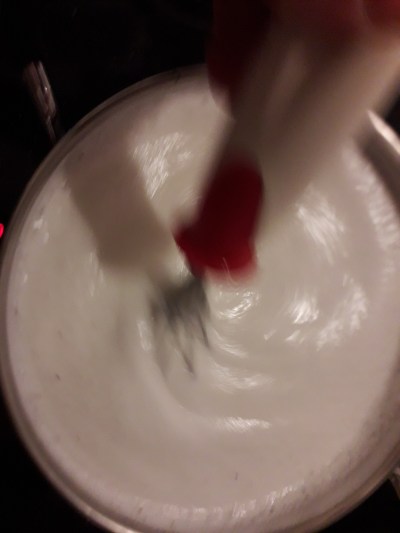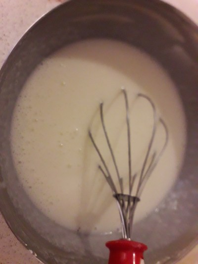 Mettete il tutto sul fuoco, a fiamma medio bassa, continuate a girare sempre nello stesso verso con una frusta, quando il composto si sarà addensato spegnere e togliere dal fuoco.