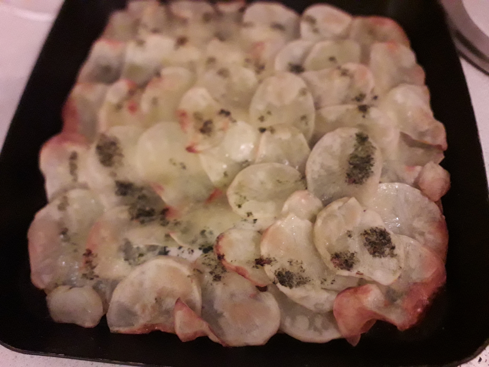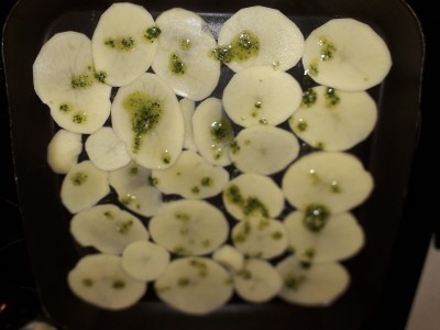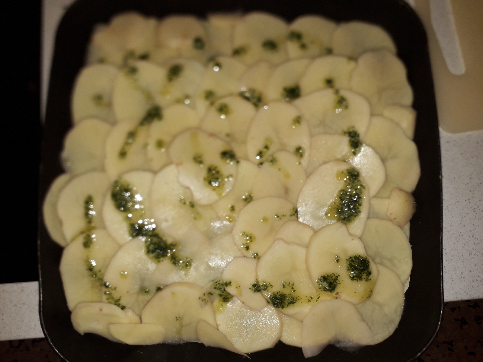 3) disponete su una teglia antiaderente le patate, in modo da tappezzarne il fondo. Prendete il mix aromatico ed usatelo per condire le patate, versandone, con l’aiuto di un cucchiaio un pò in superficie.