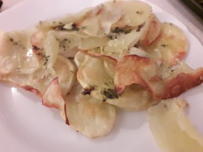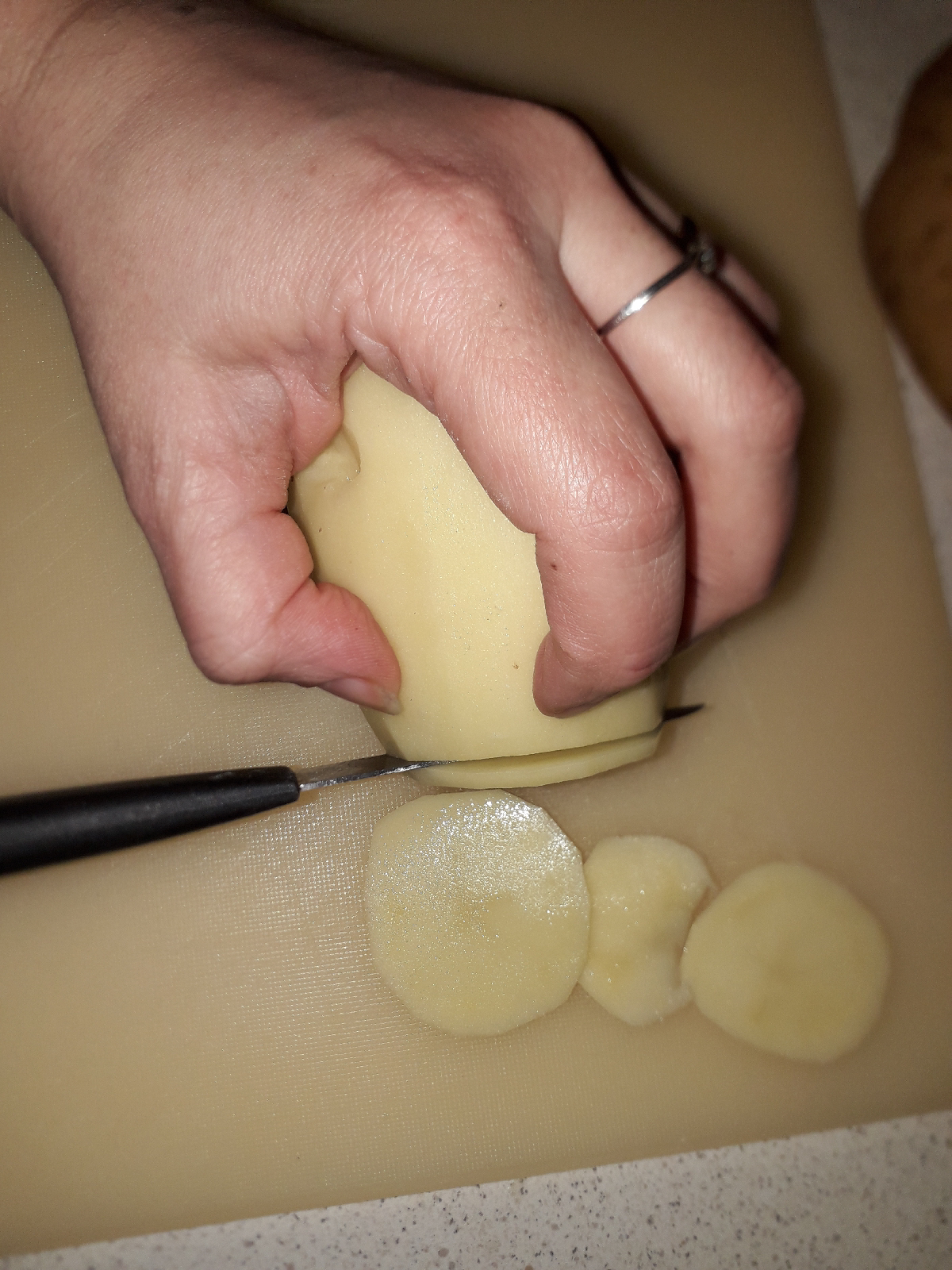 2) Lavate, pelate e tagliate le patate a rondelle fini, cercando di farle della stessa misura, sarebbe meglio utilizzare una mandolina per effettuare il taglio con precisione