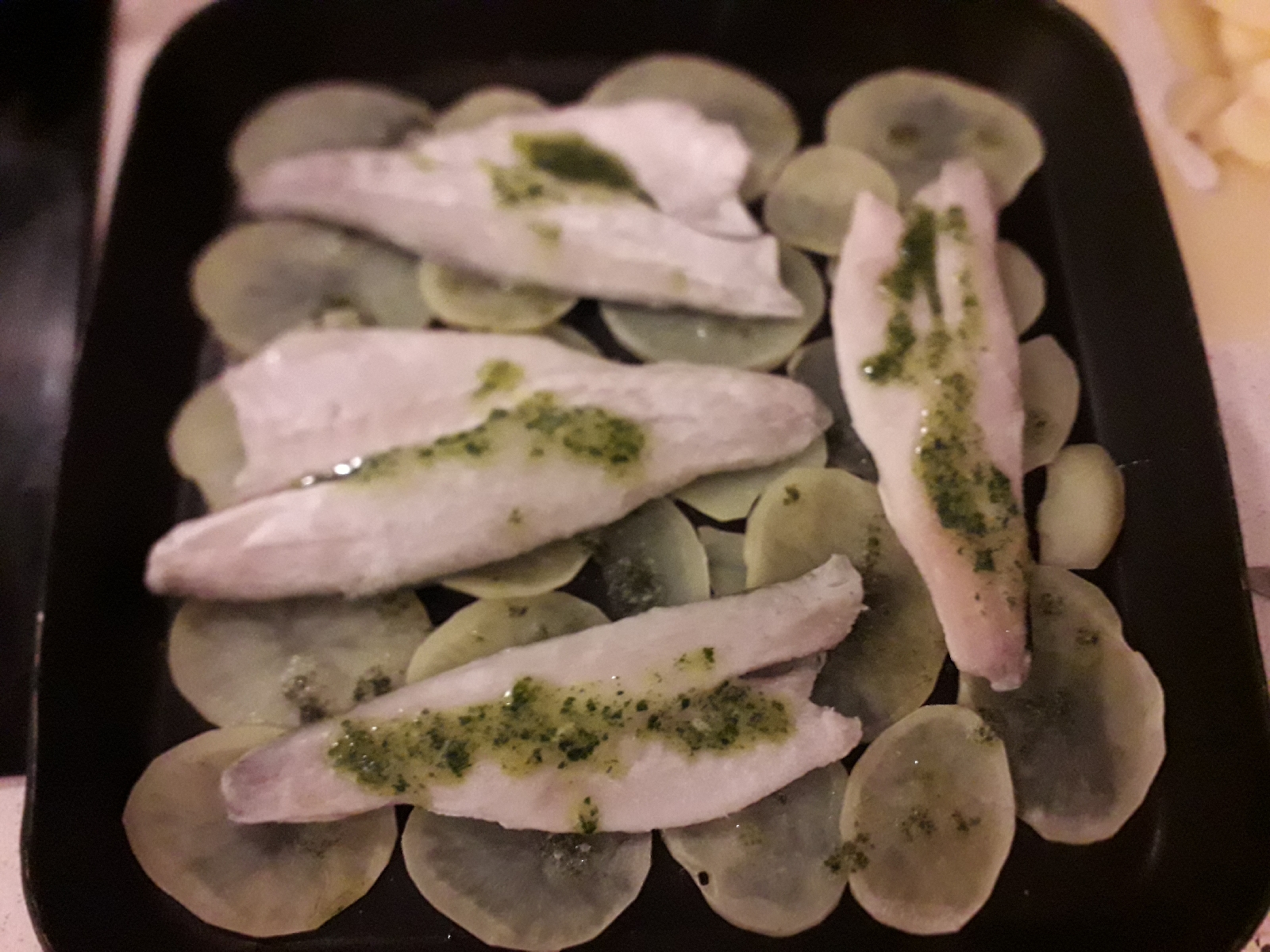 4) quando le patate si saranno un pò imbrunite, toglietele dal forno ed adagiate il pesce (nel mio caso surgelato) e cospargete con il mix aromatico