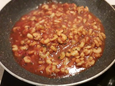 6) quando si sarà ristretto in questo modo versate la metà o un terzo dell’acqua dei gamberetti, ed aspettare che si assorba restringendo di nuovo il sugo. Ripetere 2 o 3 volte, fino ad esaurimento del liquido. (Non versate tutto insieme altrimenti il sugo saprà di bollito). Buttate nel frattempo la pasta.