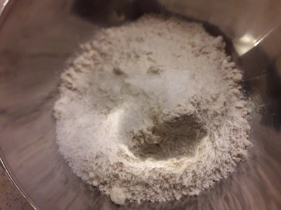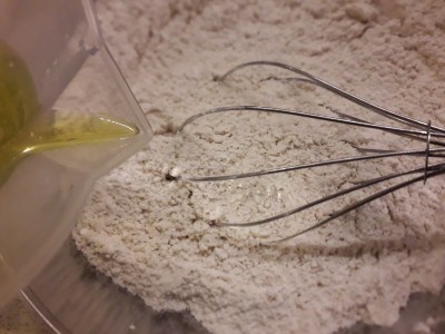 1) mettere tutti gli ingredienti in una ciotola tranne l’acqua e l’olio, amalgamateli bene, in modo che si distribuiscano gli ingredienti in maniera uniforme.