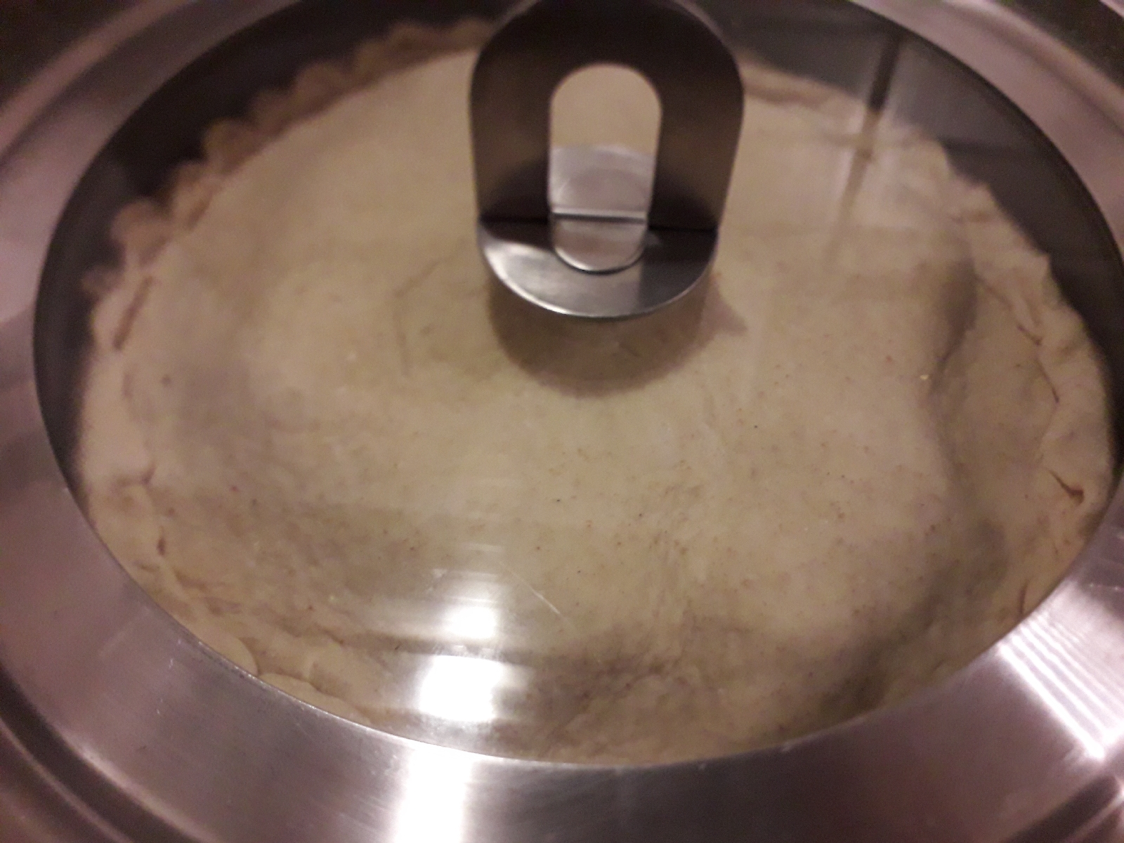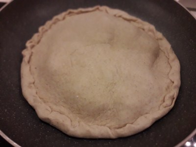 7) ricoprire con l’altro disco di pasta e sigillare i bordi. Nel frattempo in una padella mettere 2 o 3 cucchiai di olio di arachide