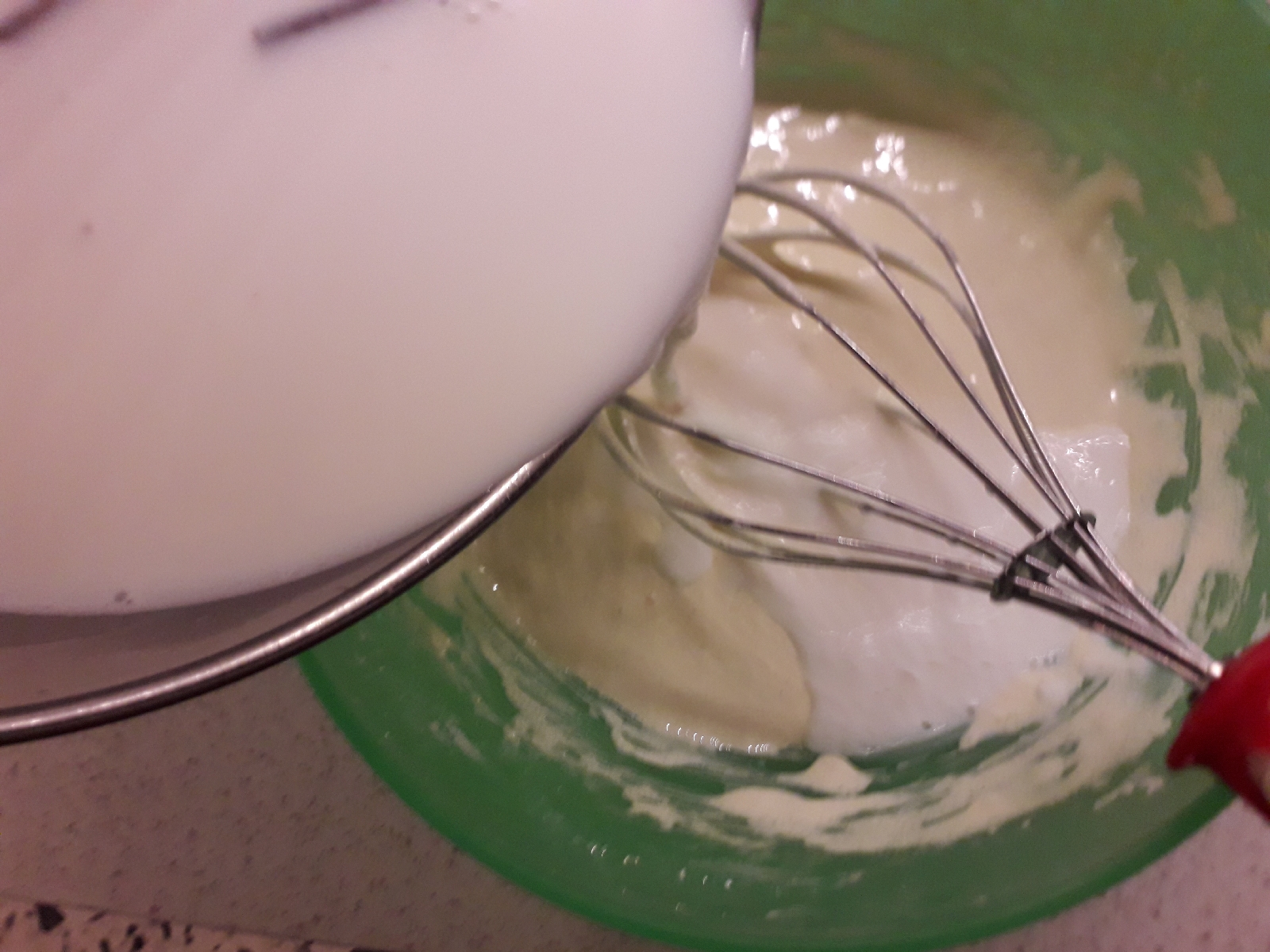 4) versare il latte nel composto di uova e rimettere sul fuoco