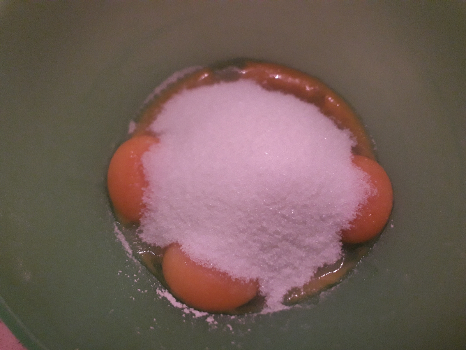 3) sbattere i tuorli con le uova ed aggiungere la mainzena, girare fino a che non sarà montato un pò l’uovo con lo zucchero ed il composto sarà diventato chiaro