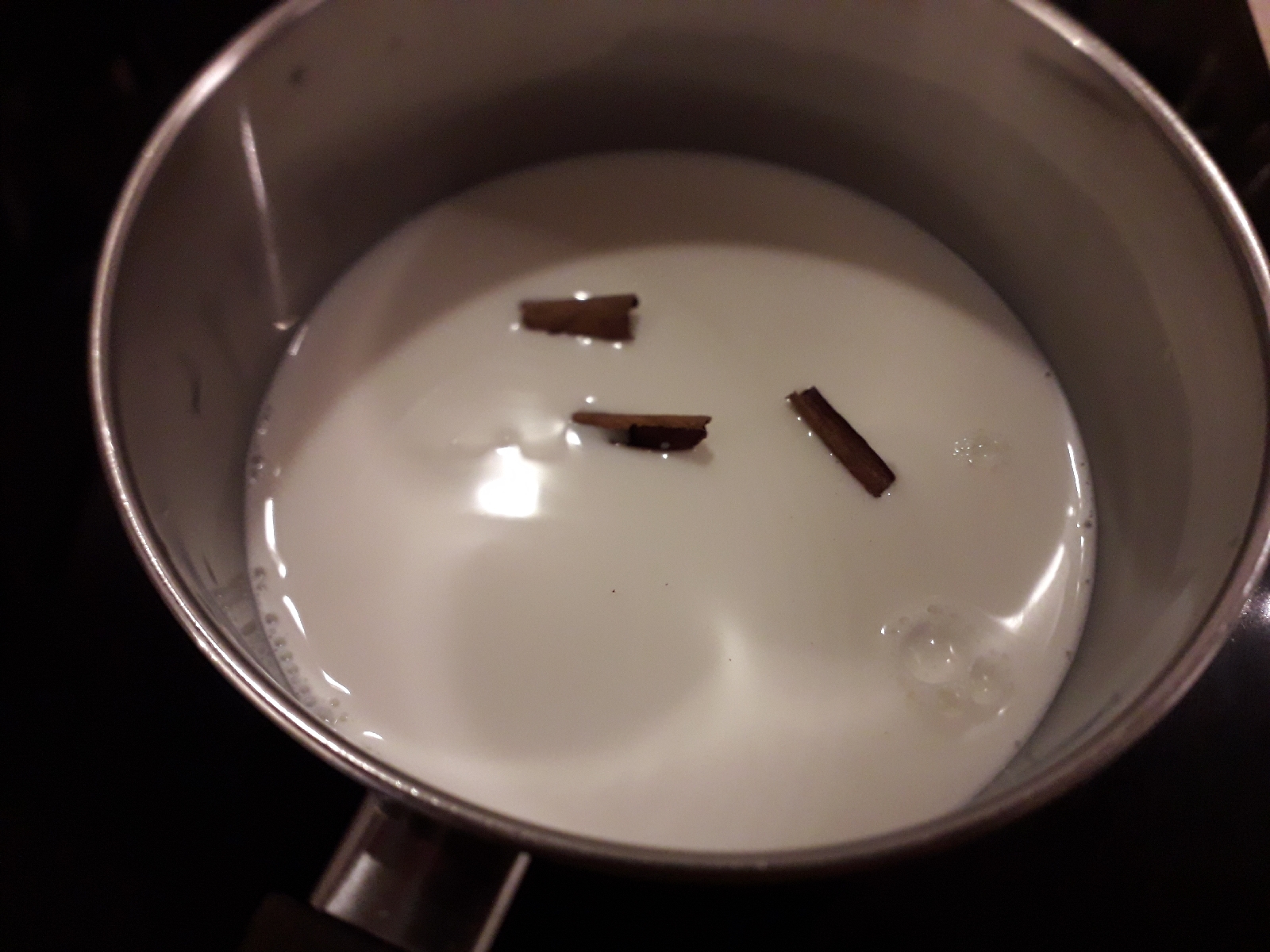 2) mettete il padellino con gli aromi che avete scelto, io ho messo cannella e vaniglia. Portare a sfiorare il bollore e togliere dal fuoco in modo che si intiepidisca
