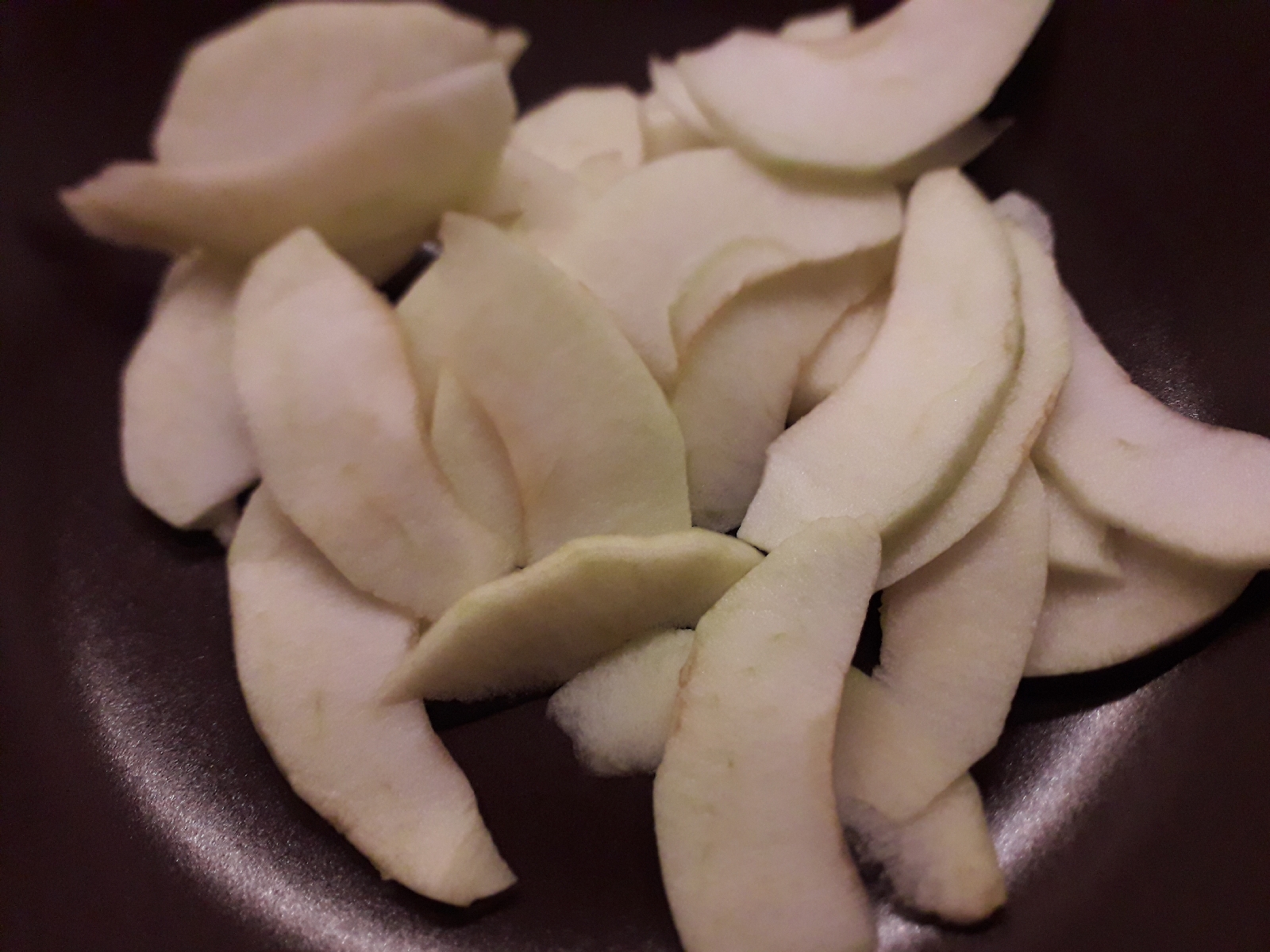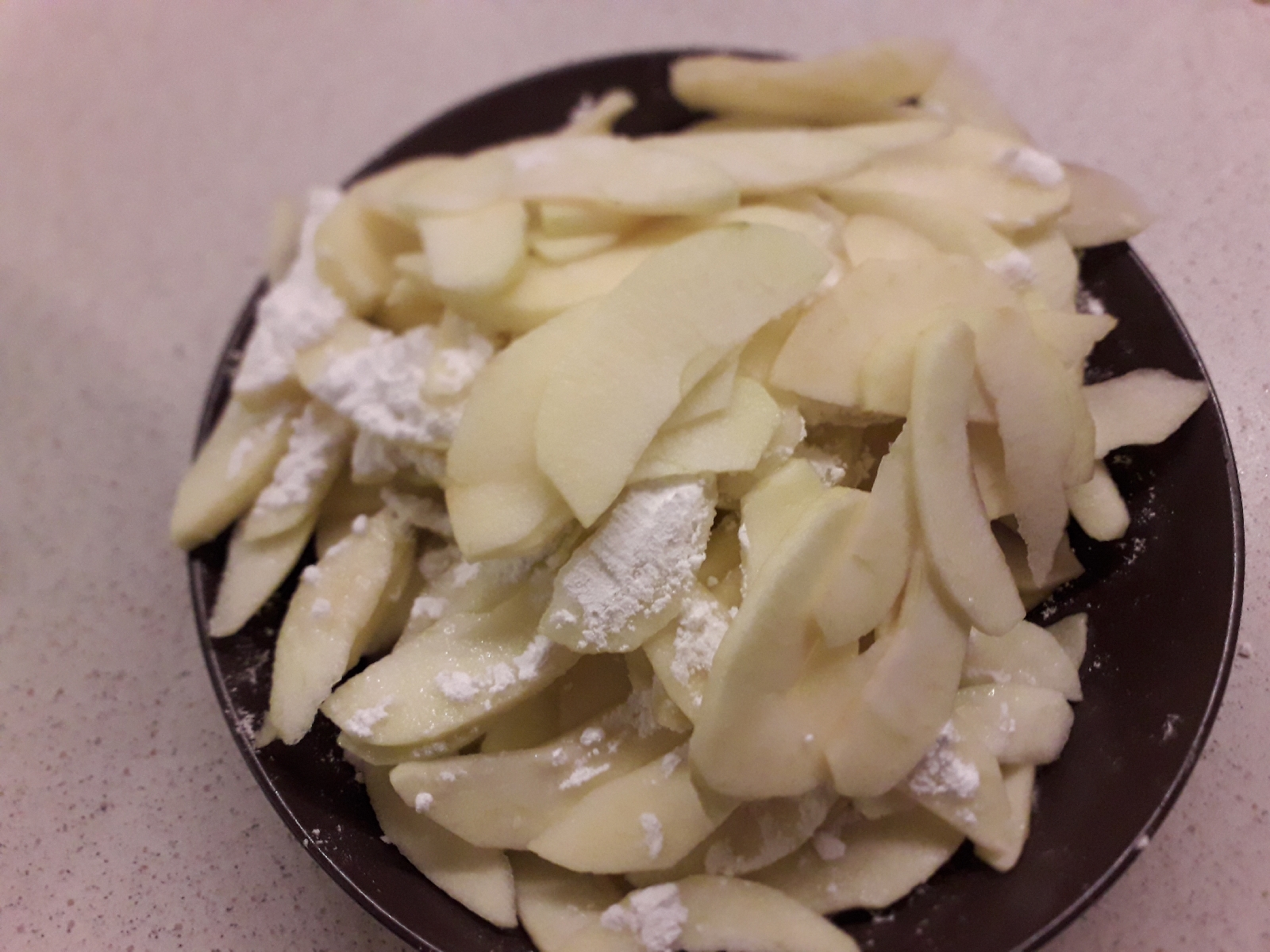 1) Tagliate le mele a spicchietti sottili di circa 2 mm e cospargete con un pò di zucchero al velo in modo che si insaporiscano. Accendete il forno a 200°