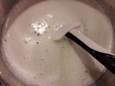 5) quando sentirete che farà un pò di resistenza, o che si sta addensando, allontanate dal fuoco, girate in modo da amalgamare tutta la parte che si era addensata e rimettere sul fuoco, ripetere più volte, fino a che non sarà tutta addensata.