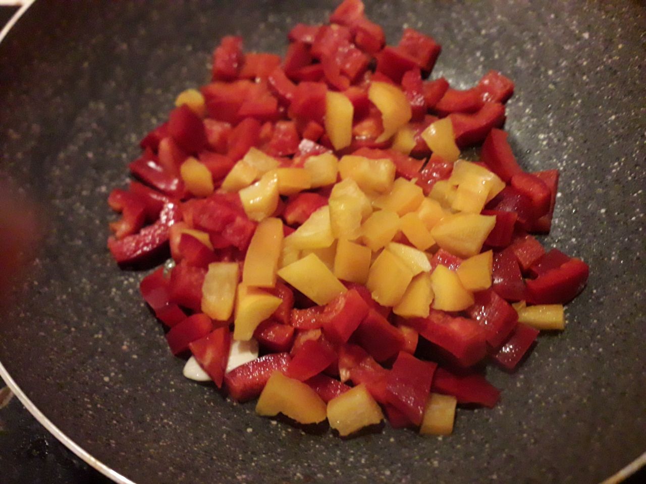 Prendete una padella, metteteci l’olio e l’aglio ed accendere il fornello a fuoco vivo, mentre l’olio si scalda, tagliate i peperoni a cubetti di 1 cm x 1 cm circa e fateli cadere nella padella mentre li tagliate.