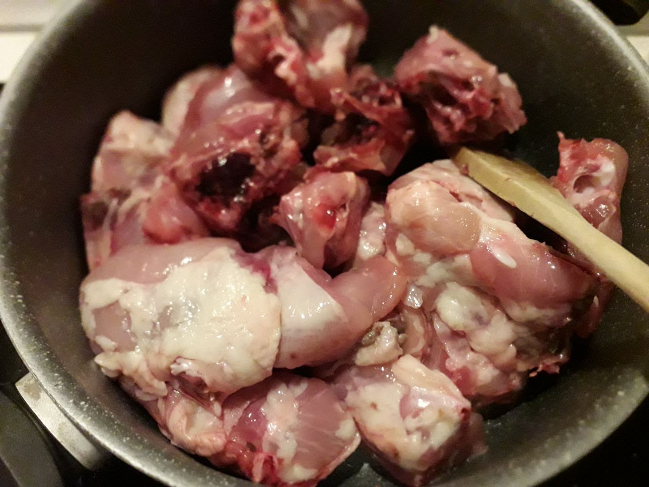 2) Spellate lo spezzatino di pollo e non appena sarà caldo l’olio, mettete il pollo e fate rosolare.