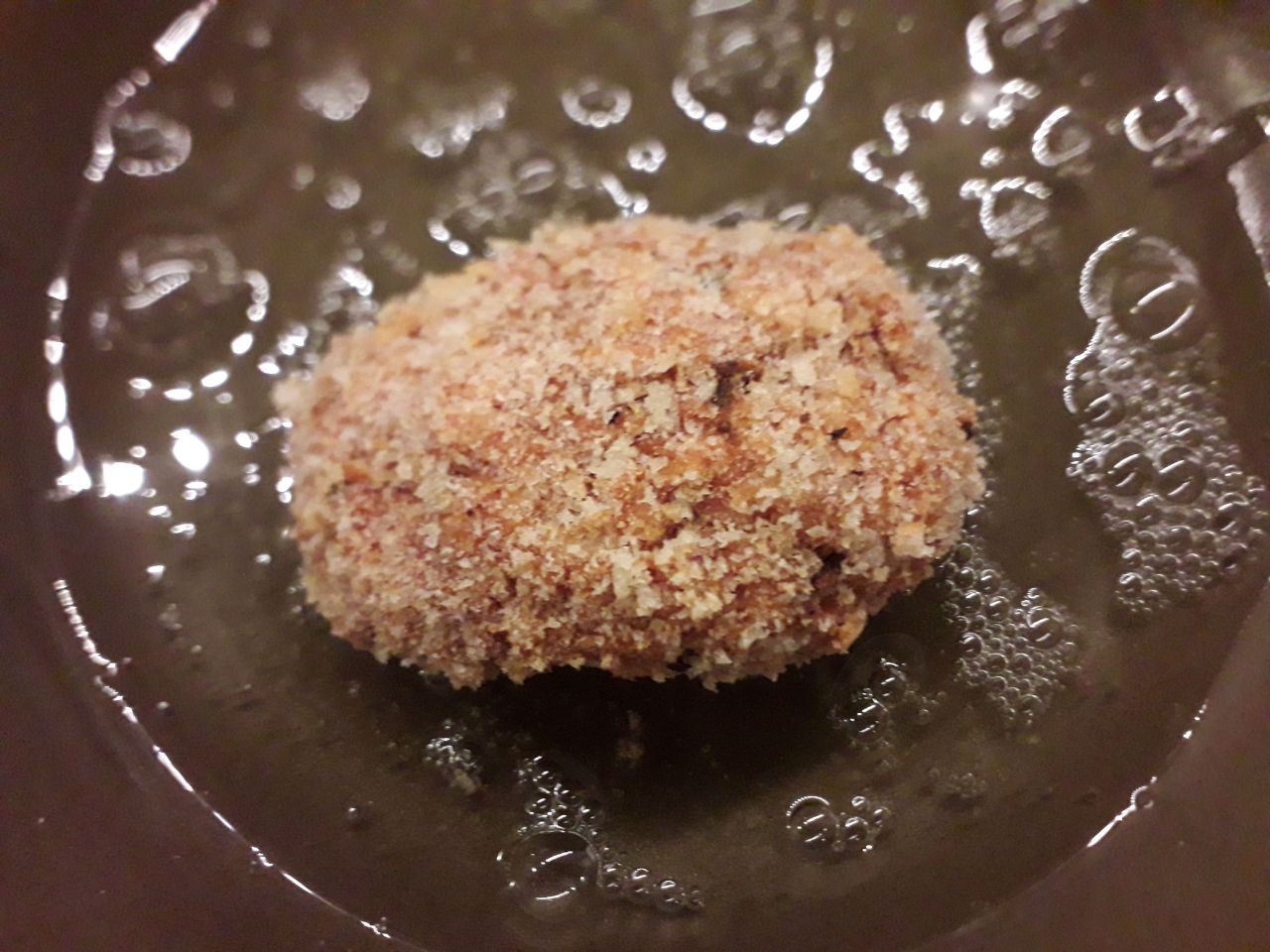 10) mettete la polpetta di riso impanata nel piatto con gli albumi e fare in modo che si bagni su tutti i lati