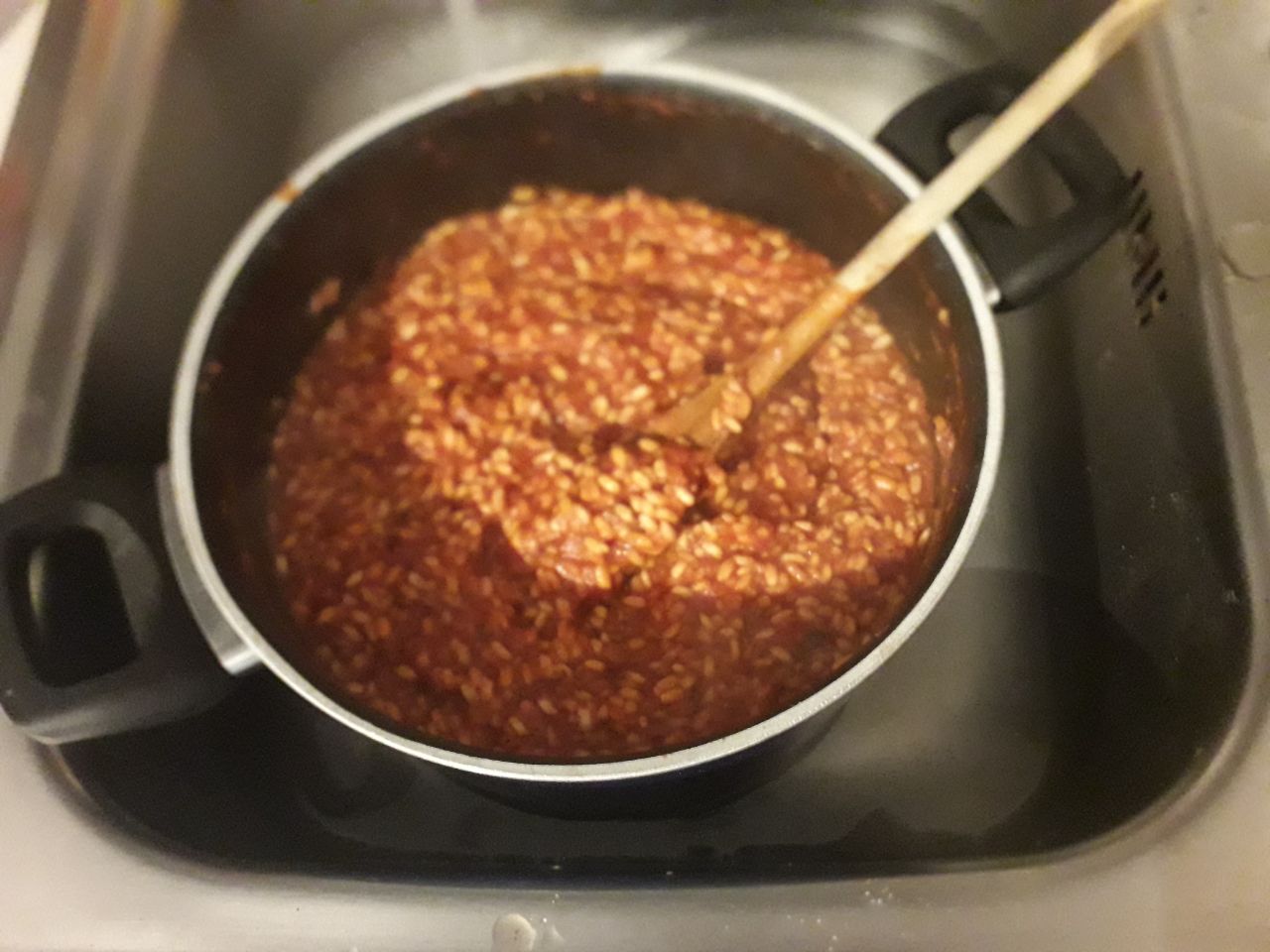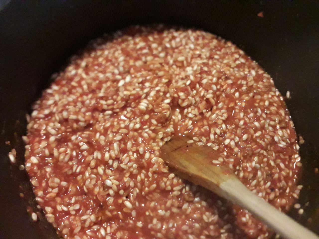 1) mettere sul fuoco il sugo e quando bollirà metteteci il riso, girando continuamente cuocete per 20/25 minuti, aiutandovi con il brodo quando sarà troppo asciutto. Quando mancheranno un paio di minuti alla cottura, togliete dal fuoco.