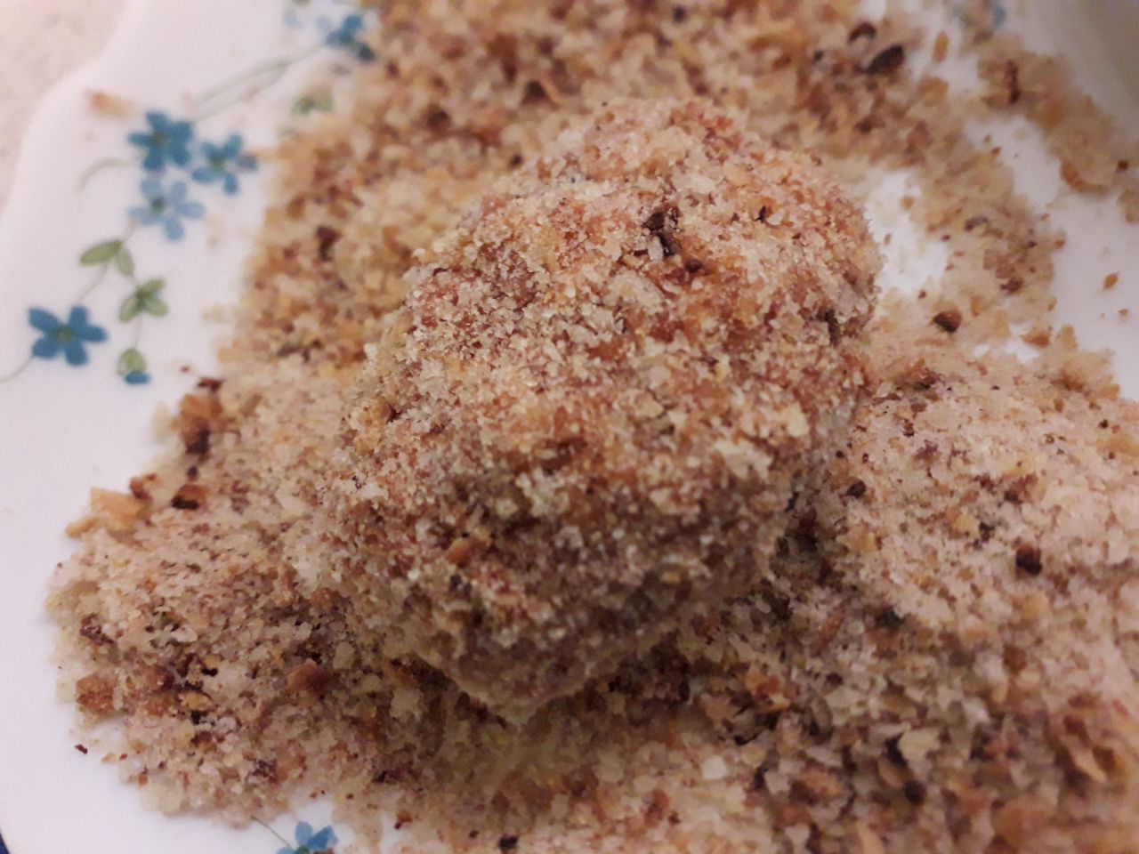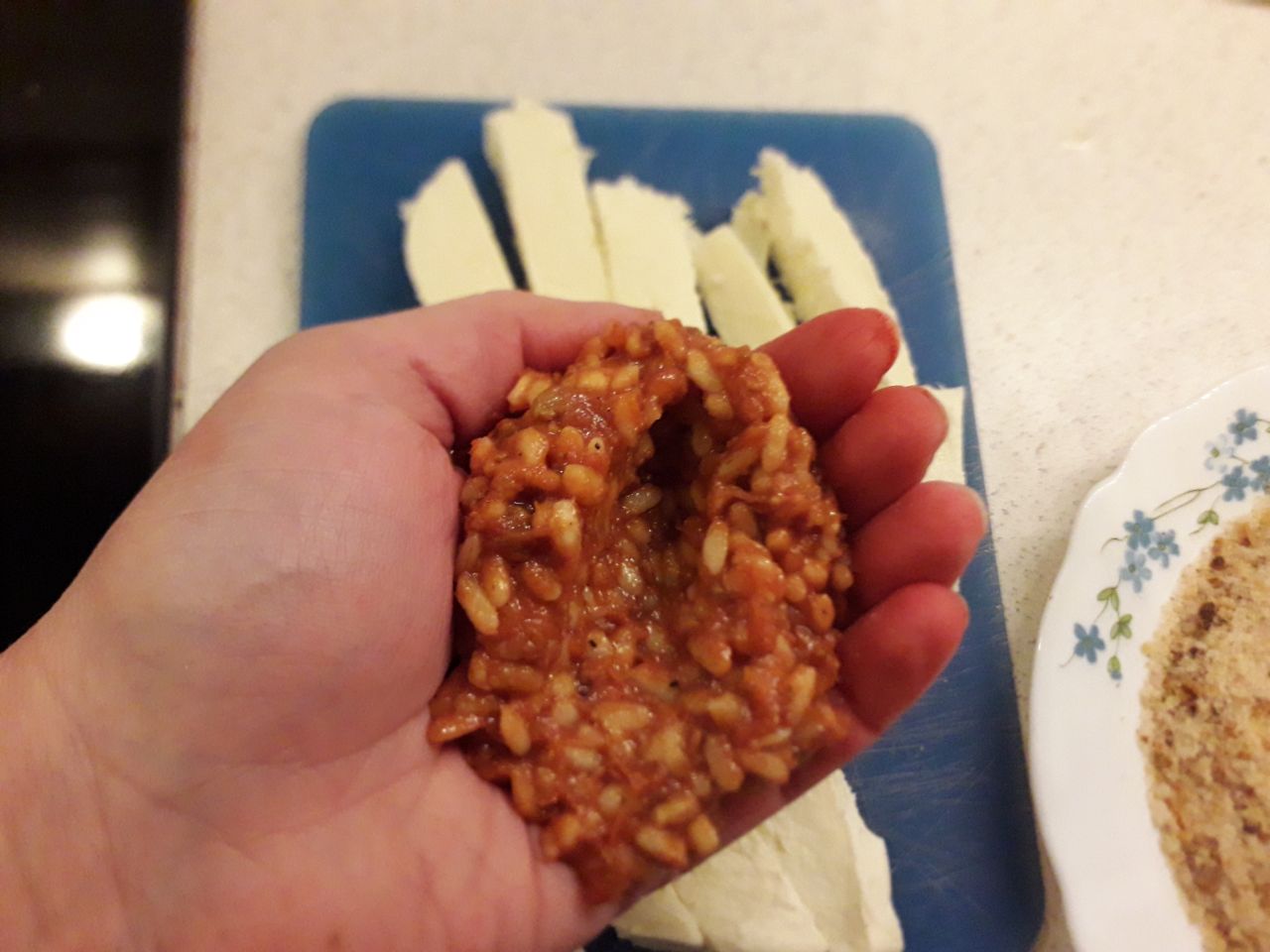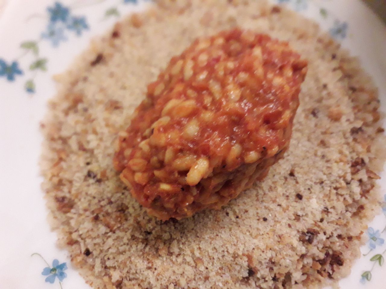 9) ora fate rotolare la polpetta di riso sul pan grattato, ricoprendolo completamente