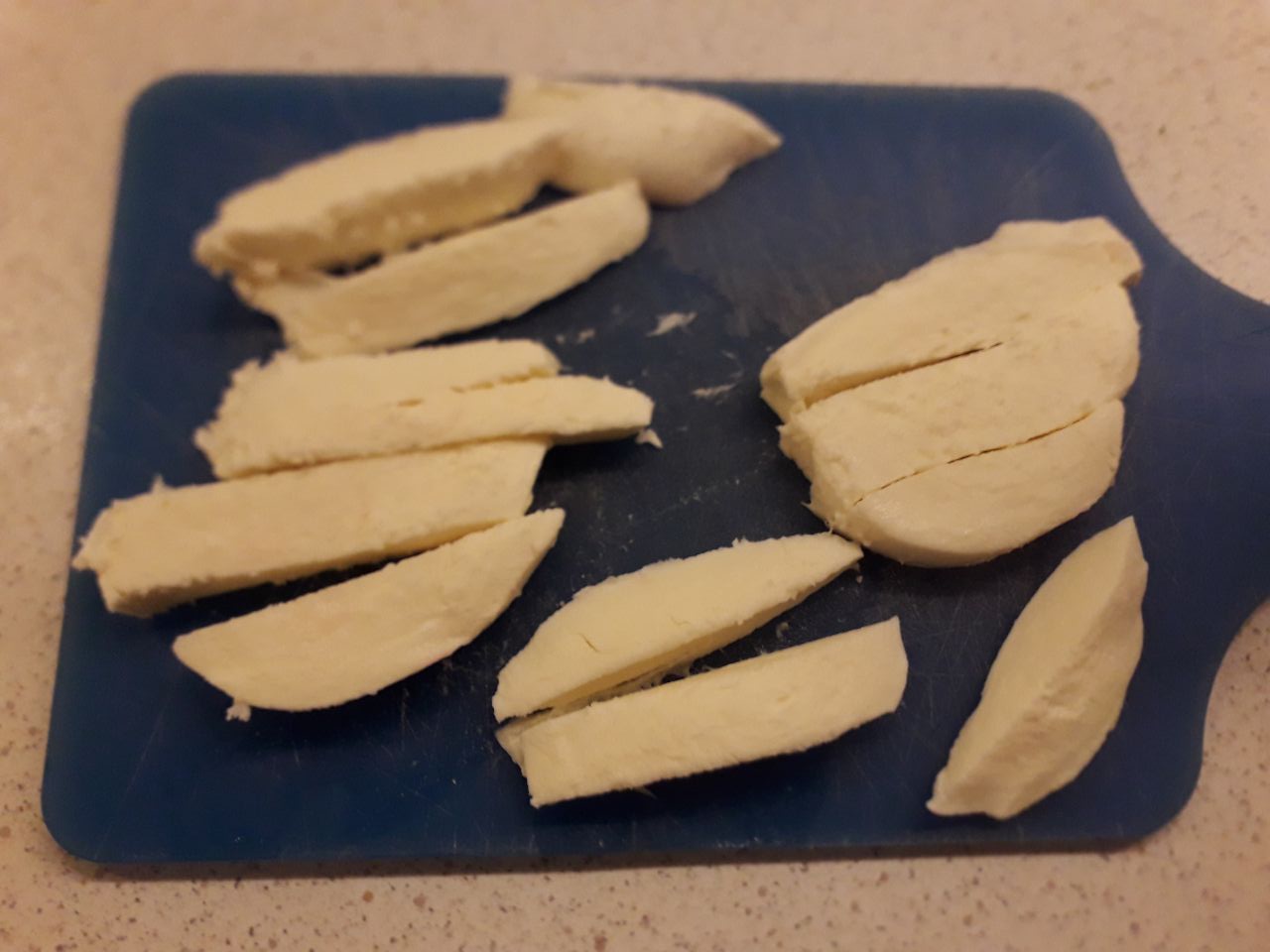 3) prendete la mozzarella e tagliatela in modo da formare delle listarelle larghe circa un centimetro e tagliatele a metà, in modo da formare dei pezzi di mozzarella di circa 1,5 cm x 4 cm circa.