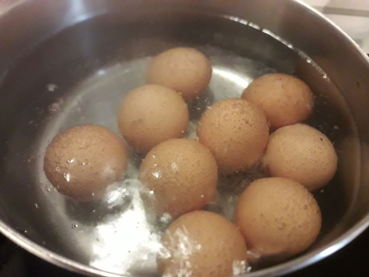 1) prendere un padellino abbastanza capiente e mettere le 9 uova, ricoprendole di acqua, sul fuoco. Contare 9 minuti da quando l’acqua ha preso il bollore.