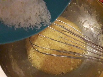 4) in una ciotola mettete le uova, il sale, il parmiggiano e se gradite un cucchiaio di farina e sbattete l’uovo