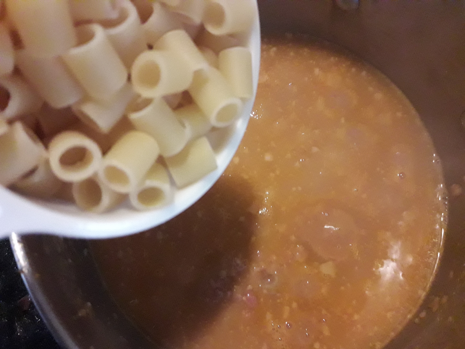 9) far cuocere fino a quasi terminare la cottura della pasta, nel caso, durante la cottura, si asciugasse troppo aggiungete altro brodo. Aggiungere il mestolo di zuppa che avevate frullato precedentemente. Quindi togliere dal fuoco un paio di minuti prima della fine cottura della pasta.